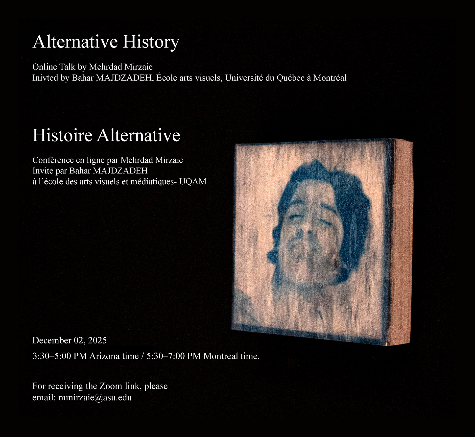 Mirzaie’s academic research extends to the history and philosophy of photography, examining images as conduits for historical narratives, political memory, and acts of storytelling. He currently serves as an Assistant Curator and Collection Assistant at Northlight Gallery at Arizona State University, deepening his experience in curatorial practice, archival studies, and image-based art. He received his MFA from Arizona State University in 2025 and is now pursuing an MA in Art History at ASU, with a research focus on Iranian image-based art and its broader connections to global art.