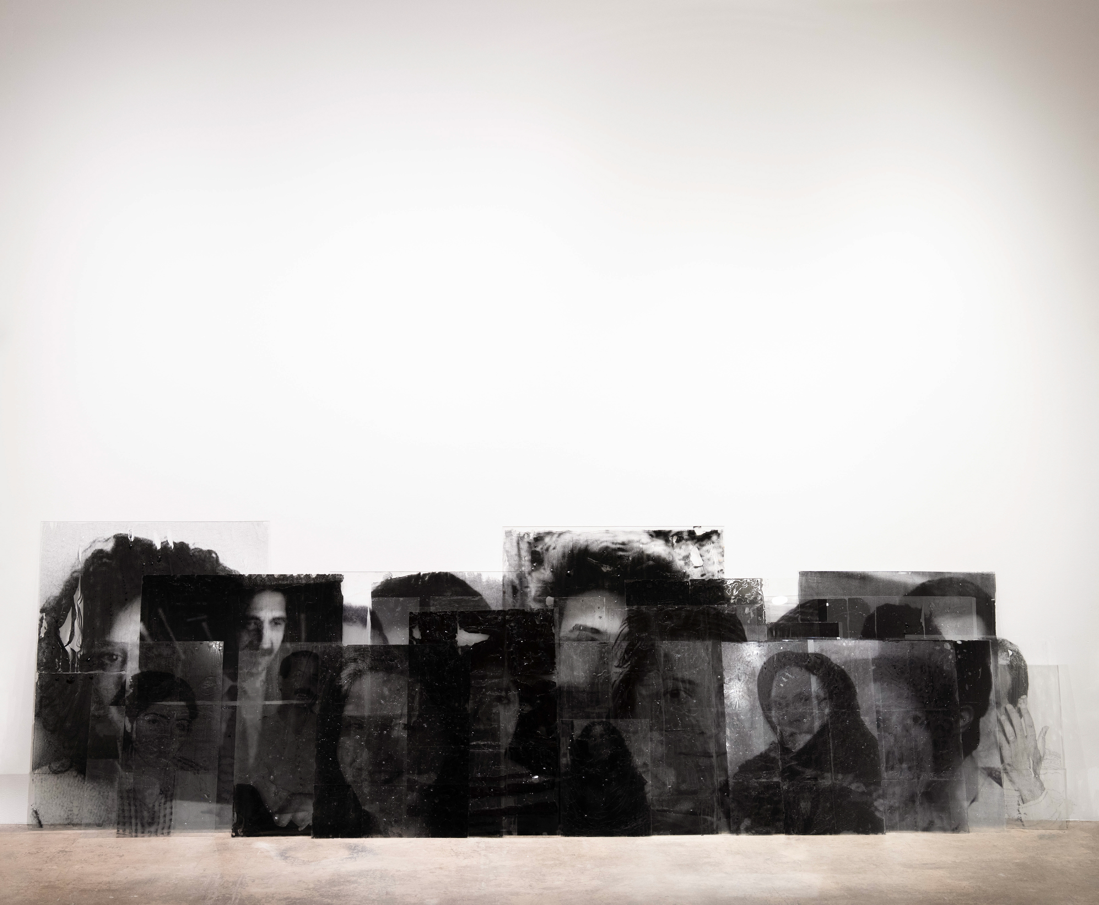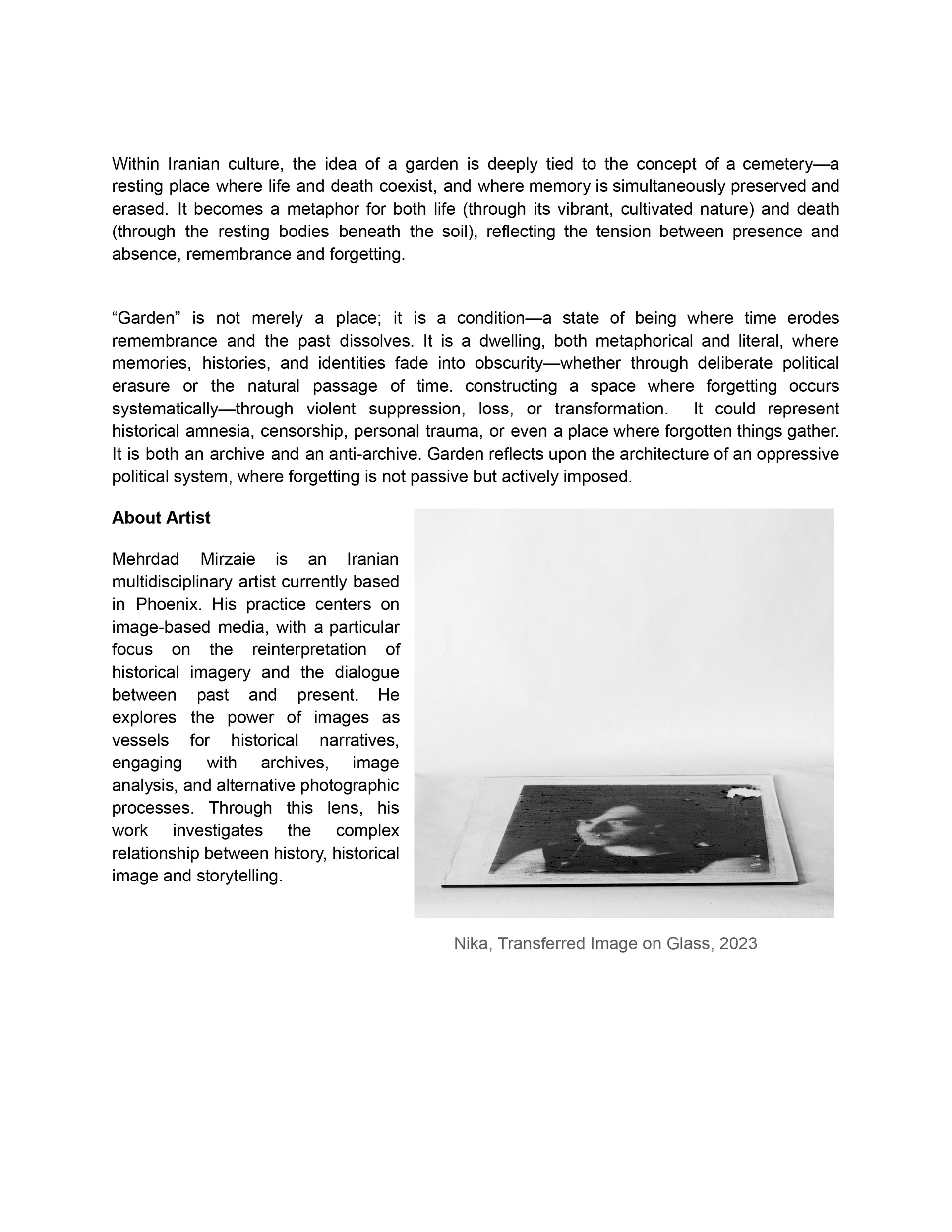 "Garden" comprises thousands of amateur photographs sourced from digital archives and social media accounts, transferred onto glass. Many of these images are manipulated, stripped of names or any contextual information. They depict individuals who lost their lives, were forcibly disappeared, or arrested due to the socio-political conditions in Iran from the Islamic Revolution of February 1979 to the present. This archive/anti-archive—an archive being a collection of photographs from digital sources that attempt to document and preserve information about these individuals—includes personal photographs from family albums or moments of everyday life, with the photographers remaining unknown. It is an anti-archive because it lacks the conventional qualities of a functional archive—it cannot serve as a reliable source of information, as it is marked by missing data, gaps, and erasures.